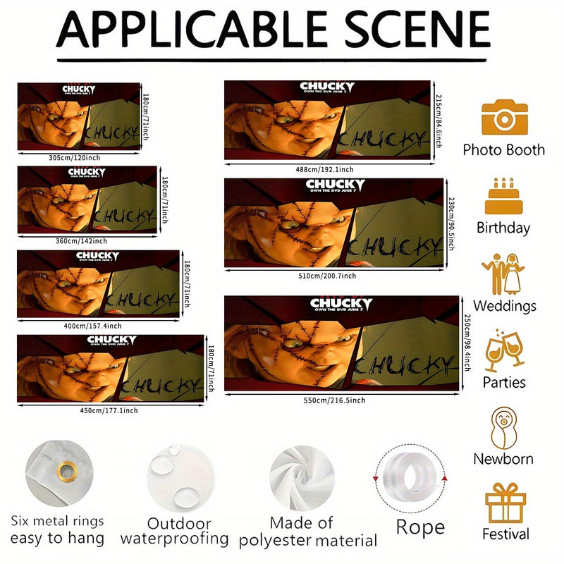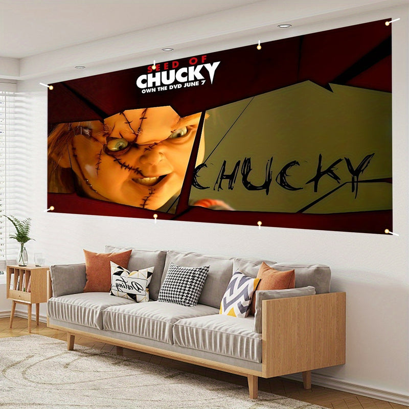 1 pieza - Cartel de puerta de garaje plano de personaje de película de terror clásica de otoño de Halloween 2D, con un patrón de espejo roto de Chucky para fiestas, adecuado para festivales, patio, paredes de fondo interior/exterior, decoración versátil
