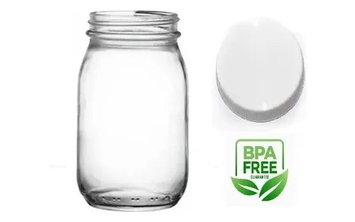 En materia de vidrio el cual es libre de BPA junto a la tapa plastica blanca