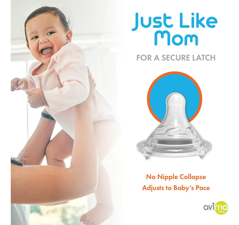 Biberones de transición suave para bebés que amamantan: los pezones de silicona más anchos incluidos promueven un pestillo natural para una transición más fácil entre la alimentación amamantada y alimentada con biberón con nuestros biberones de cuello ancho que imitan de cerca a la mamá.