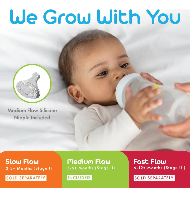 Biberones que crecen con el bebé: este juego de biberones anticólicos incluye tetinas de flujo medio típicamente de 3 a 9 meses, pero las tetinas intercambiables de flujo lento 03 meses y flujo rápido 912 meses están disponibles para cada etapa. Nuestras botellas de cuello ancho también cambian sin problemas con nuestras tapas intercambiables de silicona con boquilla a medida que se convierten en niños pequeños.
