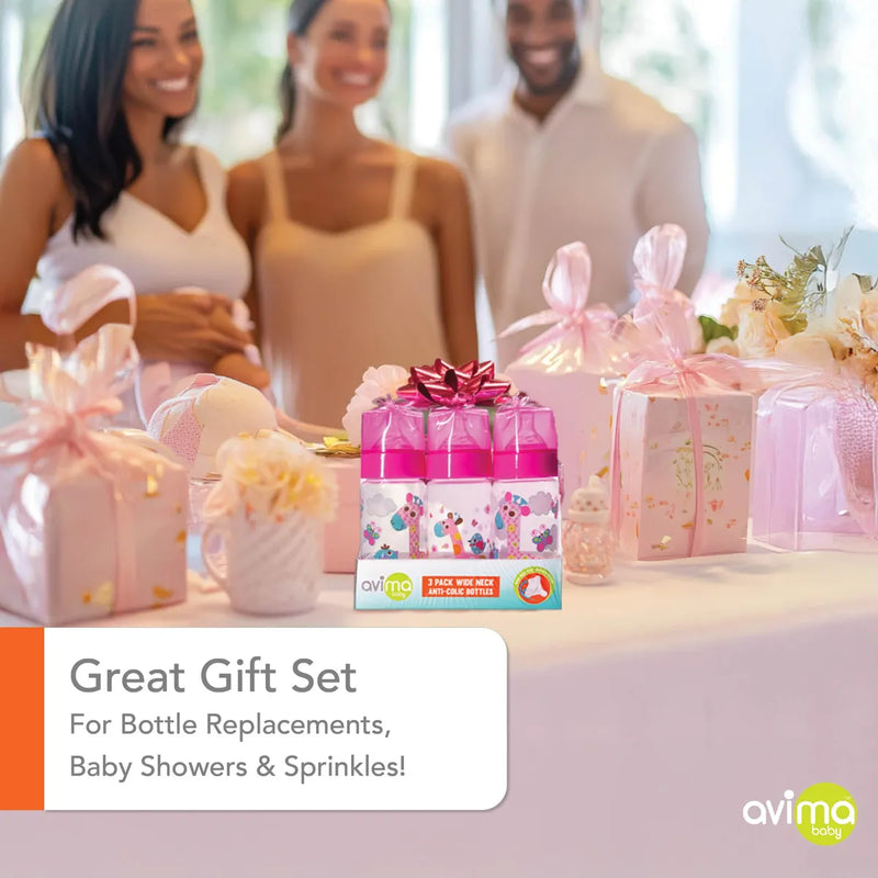 Biberones anticólicos de 9 onzas para bebés amamantados, pezones de flujo medio, biberón de cuello ancho, sin BPA, de 3 a 6 meses, etapa 2 juego de 3 biberones rosados, jirafas