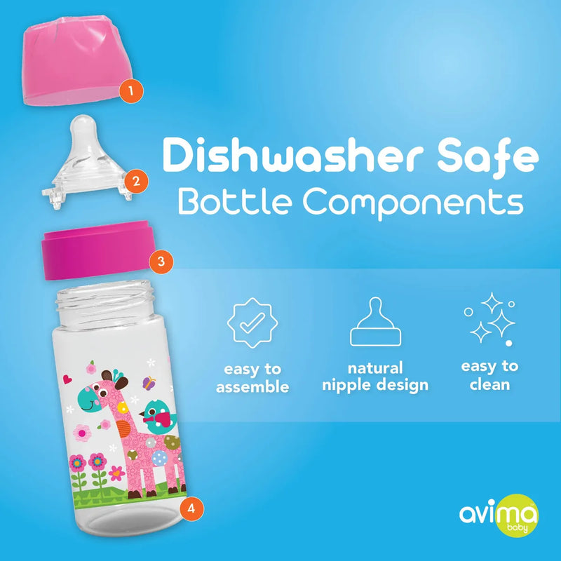 Fácil de limpiar y apto para lavavajillas: nuestro diseño a prueba de fugas es fácil de usar y montar con solo 4 piezas, y cada biberón Avima Baby es apto para lavavajillas utilizando el estante superior, ahorrándote un tiempo precioso para abrazar, tal vez incluso una siesta