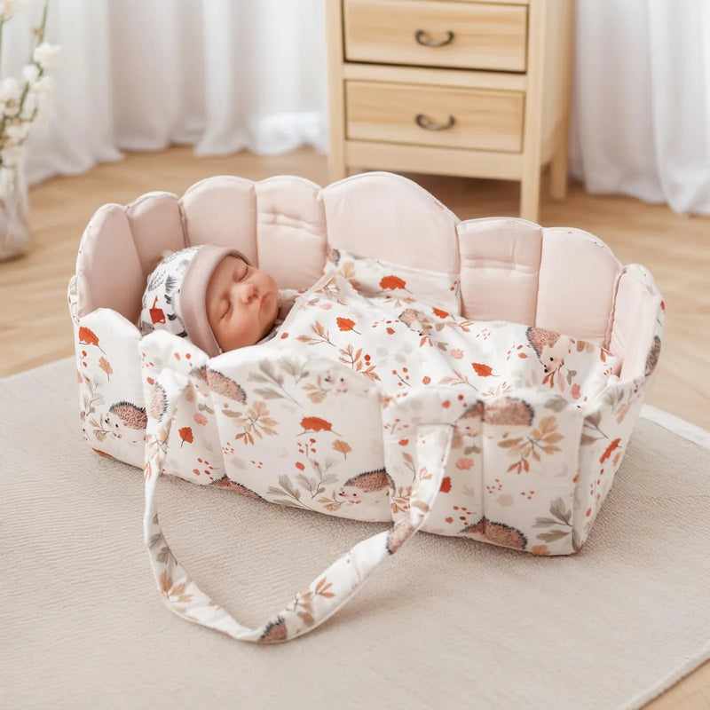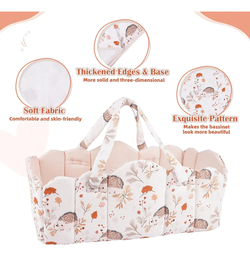 BABESIDE Juego de 3 piezas de moises para munecas de bebe con ropa de cama para munecas de 17 a 22 pulgadas, bonita cuna de muneca con estampado de animales con manta de muneca y almohada para accesorios realistas de muneca recien nacida, color blanco roto - El paquete incluye: - - - 1 moises de muneca de bebe, 1 manta de muneca de bebe, 1 almohada de muneca de bebe,