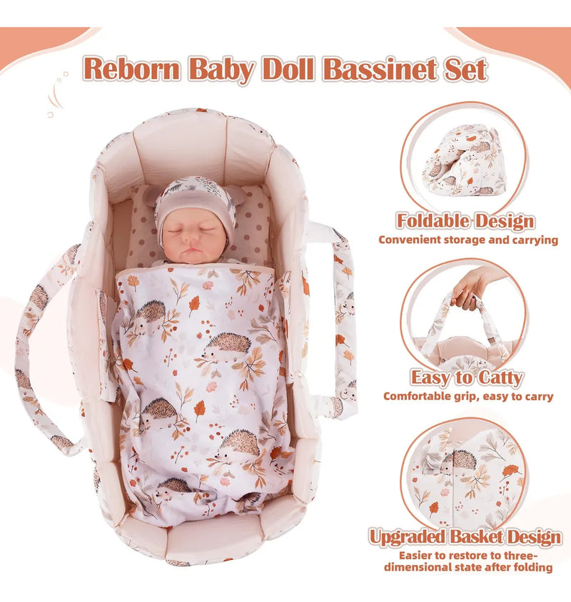,-Accesorios de bebe para munecas: nuestro juego de accesorios para munecas Reborn viene en un bonito paquete, el moises de muneca y el juego de ropa de cama de muneca puede cuidar bien de las munecas Reborn de 17 a 22 pulgadas, por lo que es un accesorio ideal para bebes Reborn para munecas