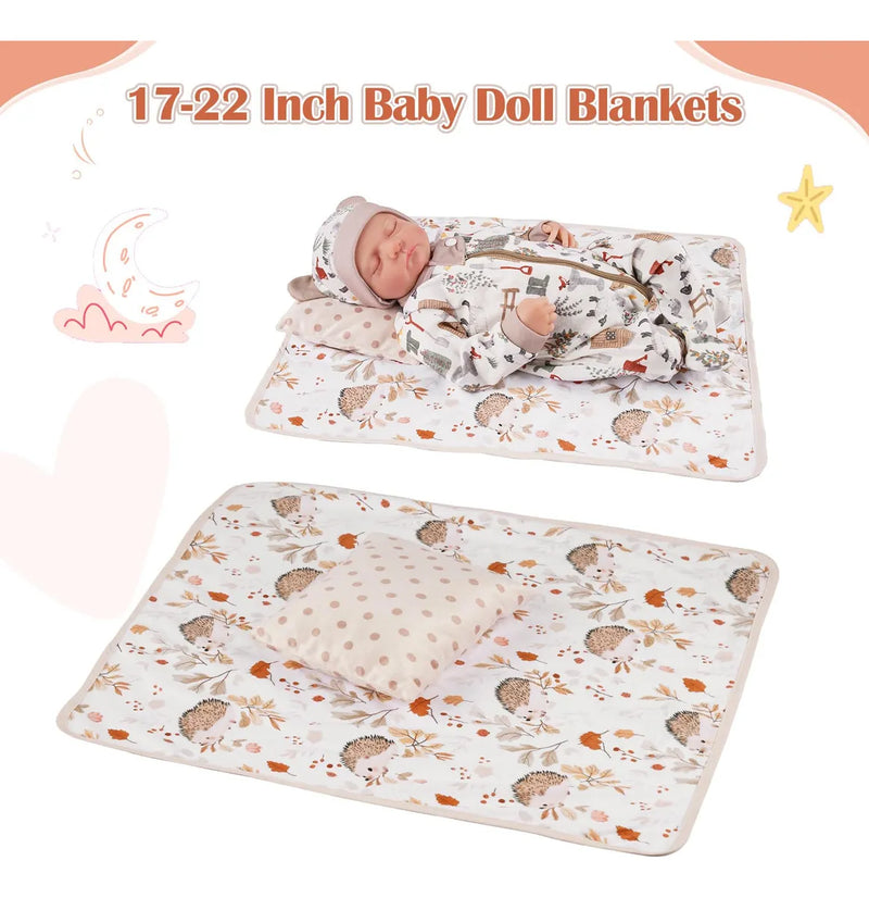 ,-Tamano de los accesorios para munecas de bebe: el moises de muneca Reborn y el juego de ropa de cama de muneca son adecuados para munecas de 17-18-19-20-21-22 pulgadas, estas cuna de muneca y manta de muneca se pueden lavar a mano o lavar a maquina y reutilizar