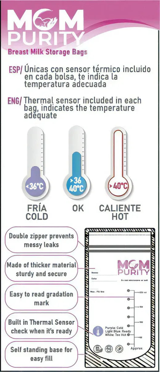 Estas bolsas de almacenamiento de leche materna están diseñadas especialmente para madres lactantes que buscan seguridad, comodidad y eficiencia al guardar su leche. Con capacidad de hasta 200 ml por unidad, permiten conservar la leche de forma higiénica y práctica, ya sea para refrigerar o congelar. Su indicador térmico innovador cambia de color según la temperatura de la leche, ayudando a garantizar que siempre esté en condiciones óptimas para alimentar a tu bebé.