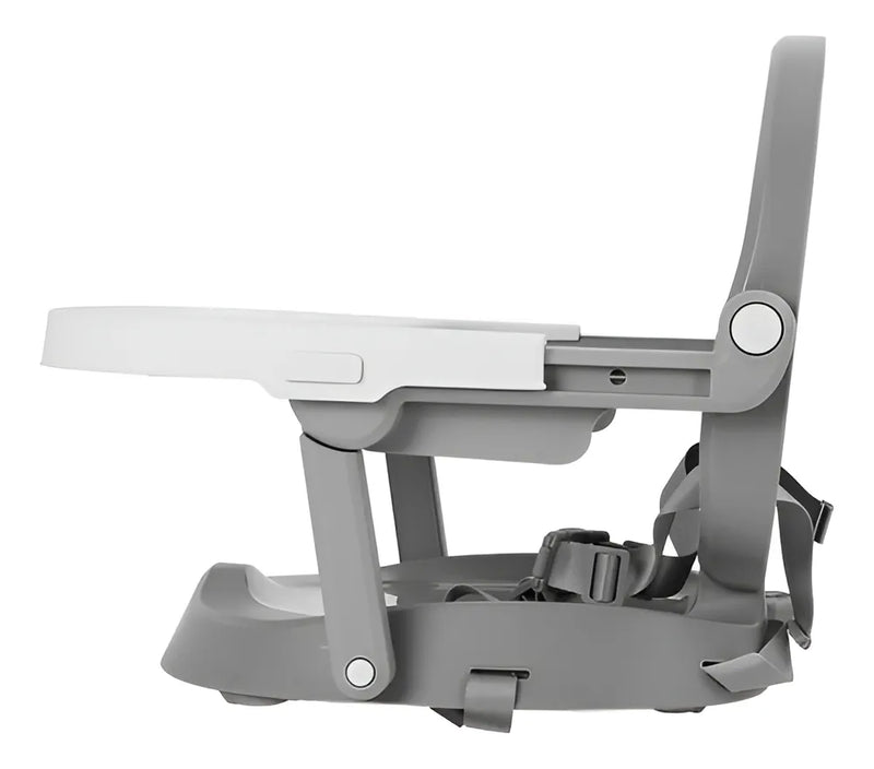 La seguridad es un punto clave: se fija mediante dos arneses resistentes que se sujetan al respaldo y asiento de la silla, y un cinturón de tres puntos que mantiene al bebé contenido sin incomodarlo. Además, las patas antideslizantes refuerzan su estabilidad sobre todo tipo de superficie.