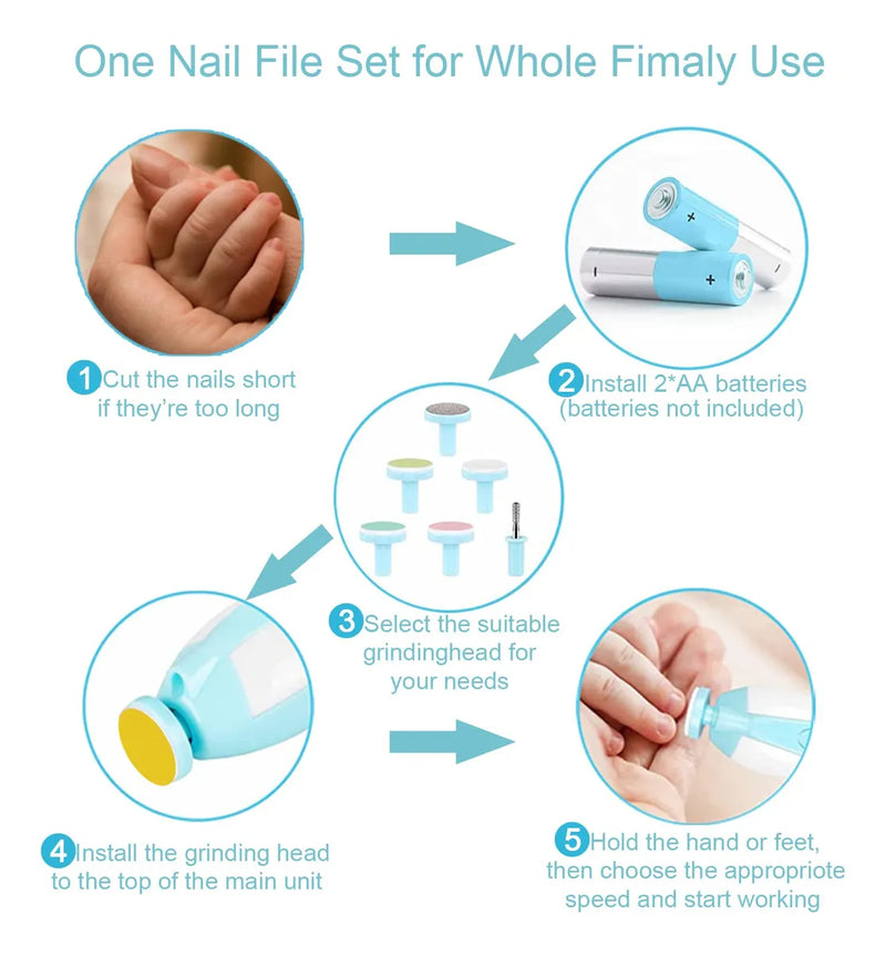 ¿Te preocupa que el bebe se agriete la cara, o las unas del bebe se conviertan en carne o danen la piel del bebe cuando se usa un cortaunas? Hay una manera de resolver el problema: nuestra lima de unas electrica para bebes, que es adecuada para diferentes edades como bebes, adultos, especialmente para recien nacidos. Caracteristicas principales: 1. 6 cabezas de gringding, se pueden uesd para recien nacidos, bebes y adultos 2. operacion de un solo boton y facil llevar con diseno compacto 3. 4 potencia ajustable (2 velocidades y en sentido horario/antihorario) y rotacion de 360 grados 3. Comodo de usar en condiciones oscuras con luz LED incorporada. 4. Silencioso, puede funcionar incluso el bebe esta durmiendo sin despertarse. 4 modos de velocidad de trabajo R2----Girando en sentido antihorario con alta velocidad R1----Girando en sentido antihorario con baja velocidad El "0" significa el modo Apagado. L1----Girando en sentido horario con baja velocidad L2----SRotating en sentido horario con alta velocidad Pasos de funcionamiento: 1. Si la una es demasiado larga, puede cortar a la longitud adecuada 2. Instala 2 pilas AA (que no estan incluidas en el paquete) 3. Elija el cabezal de molienda cuitable segun diferentes edades 4. Presione el boton y elija la velocidad necesaria para comenzar Atencion: 1. Baterias no incluidas en el paquete 2. Si no usas la recortadora durante mucho tiempo, retira las pilas. 3. Mantener alejado de los ninos. 4. Hay 3 cabezas granding para adultos, no utilizar para el bebe. 5. Si las unas son demasiado largas, es mejor cortar la una un poco antes de usar el kit de aseo