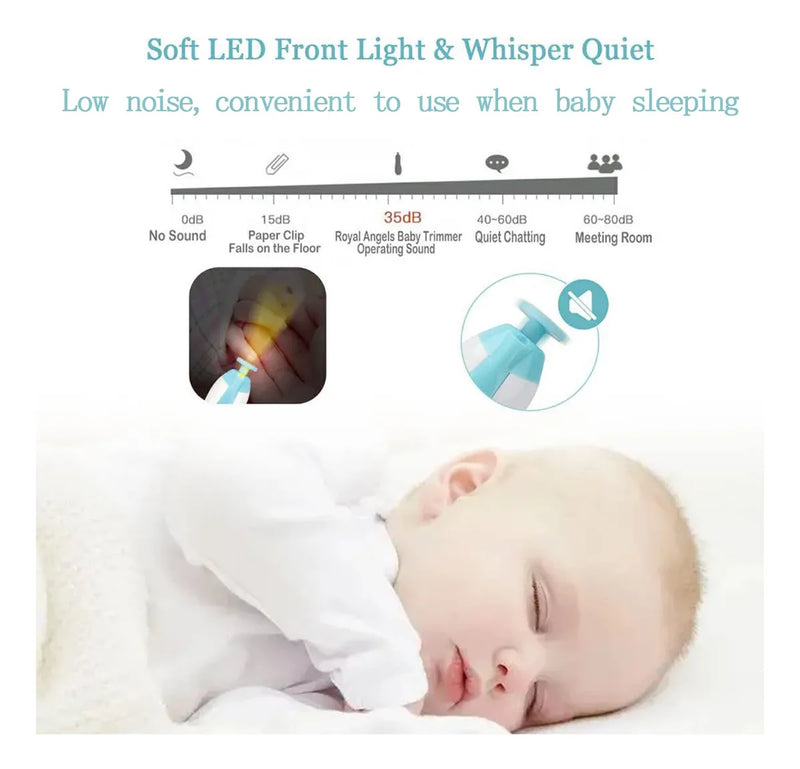 ,-[Luz LED y susurro bastante]: equipado con un motor silencioso, nuestro cortaunas para ninos pequenos puede funcionar cuando el bebe duerme sin despertarlo. Y este temporizador de unas para bebe tiene luz LED suave, se puede utilizar cuando esta en una luz oscura