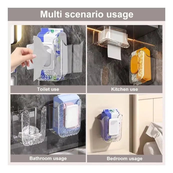 La caja de toallitas húmedas está hecha de material de alta calidad, con diseño montado en la pared puede ahorrar espacio de manera efectiva, cuelga la caja de toallitas húmedas en la pared, no ocupa espacio de escritorio o mostrador, hace que el ambiente sea más limpio y ordenado