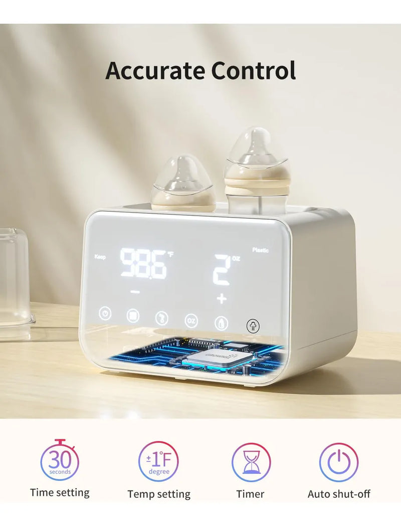 ,-Diseno de doble botella: calentadores de botellas para todas las botellas, dos botellas de gran capacidad pueden contener dos botellas de todos los tamanos y materiales para calentar la leche materna, formula o agua, comodo de usar y ahorrar tiempo. Tambien puede descongelar la leche materna, calentar los alimentos para bebes, mantener caliente las 24 horas permite a la mama preparar leche para bebes en cualquier momento.