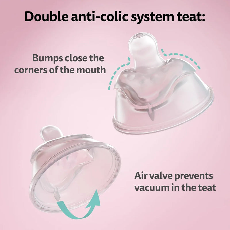 SISTEMA ANTICÓLICO DOBLE ÚNICO: Este sistema único proporciona una doble protección gracias a la tetina de forma ergonómica que cierra las comisuras de la boca de su bebé, evitando que traguen aire. Las válvulas de aire evitan que se forme un vacío dentro de la botella.