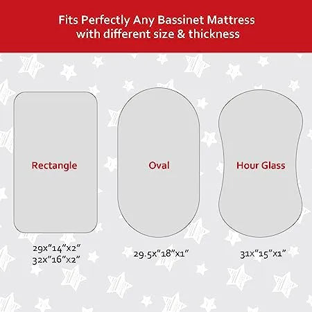 Ajuste flexible: 33 x 17 pulgadas. Nuestras sábanas de moisés se adaptan a casi todos los colchones estándar ovalados, redondos, rectangulares y con forma de reloj de arena. Cada sábana viene con una banda elástica envuelta en la parte inferior para mayor seguridad.