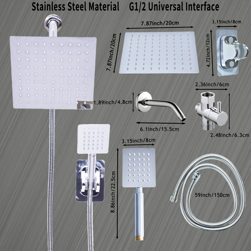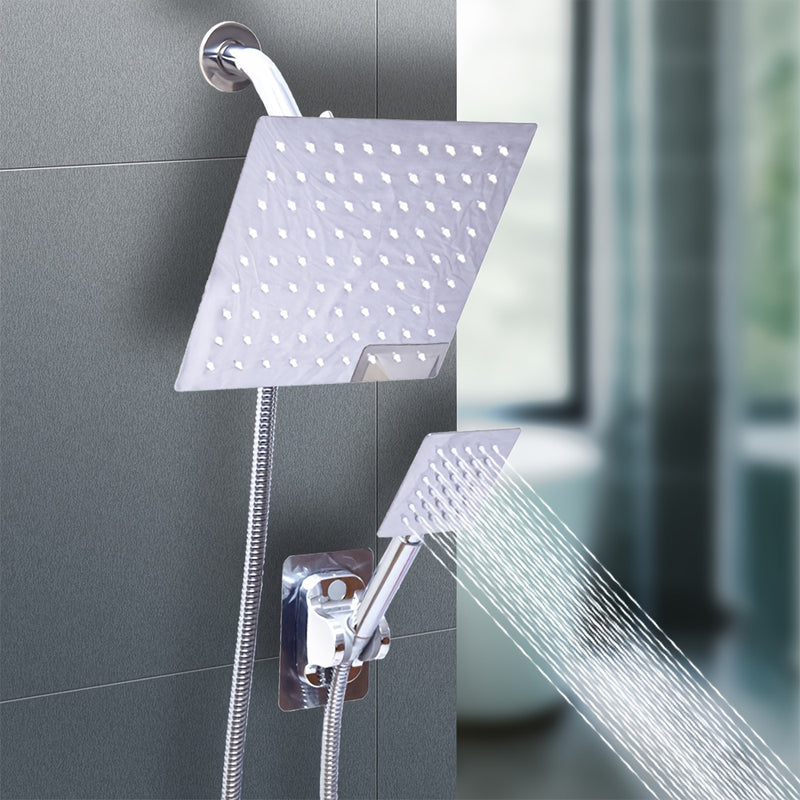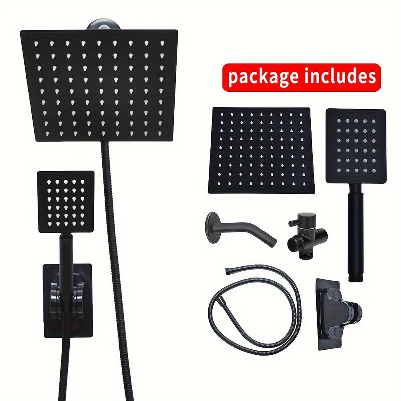 Juego de cabezal de ducha de lujo MLD con lluvia cuadrada y rociador de mano - Alta presión, manguera extra larga de 149.86 cm, desviador de 3 vías, montaje adhesivo y brazo extensible - Acabado negro elegante y plateado, soporte para cabezal de ducha, a
