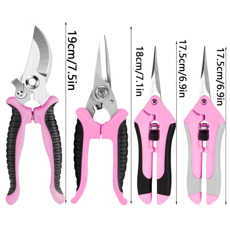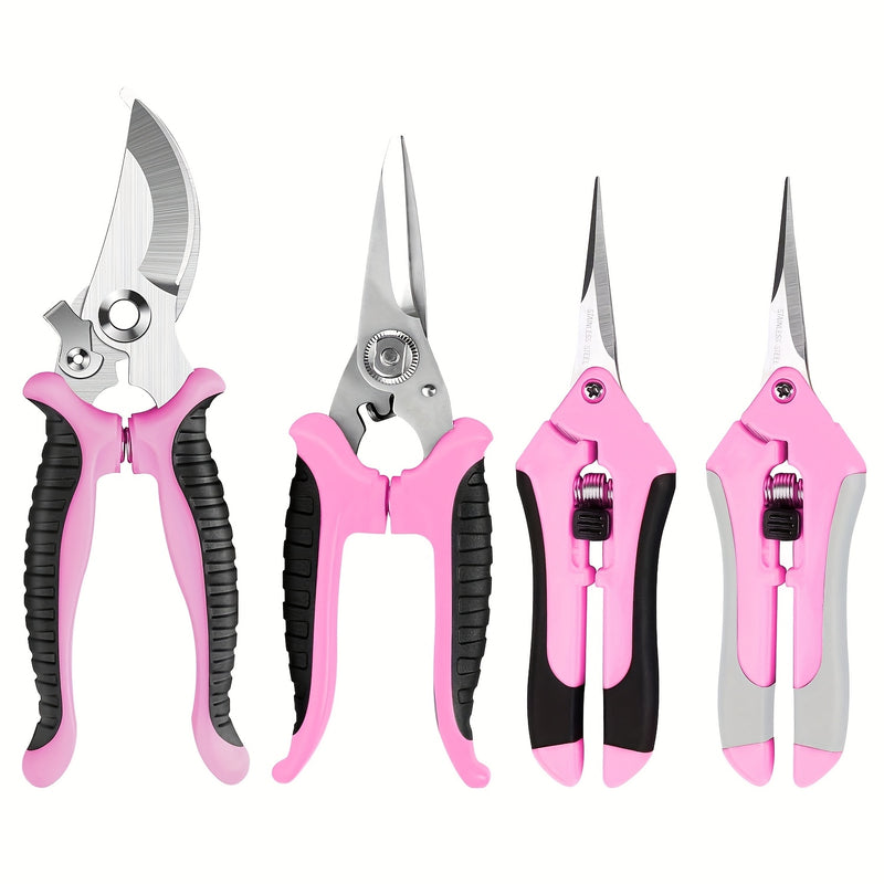 Juego de herramientas de podar manual con cuchillas de acero inoxidable, tijeras de jardinería profesionales rosadas para podar flores y jardinaje (4 piezas)