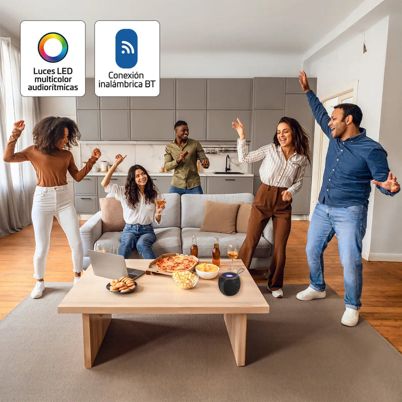 Este parlante esférico recargable combina la potencia de un audio cristalino con un espectáculo visual de luces LED rítmicas, adaptadas a tus gustos musicales.