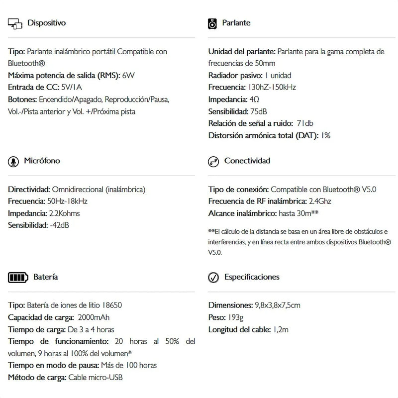 • Tipo: Parlante inalámbrico portátil Compatible con Bluetooth