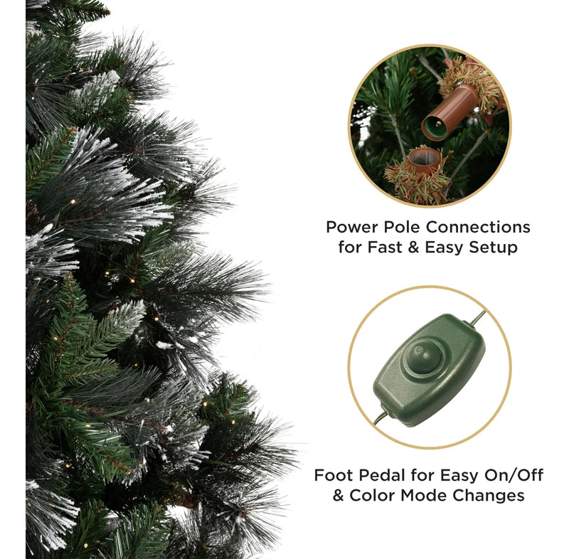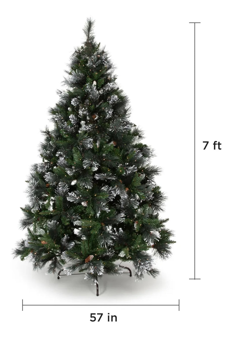 -Delicioso realismo: este arbol de Navidad LED de pino de Carolina esmerilado mide 7 pies de alto con un diametro de base de 57 pulgadas. Imita perfectamente la exuberante textura y el color vibrante de un verdadero pino de carolina. Las puntas escarchadas, cubiertas de nieve y los pinas le dan un aspecto invernal recien espolvoreado.