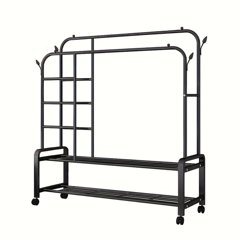 Perchero Metálico Rodante, Colgador de Doble Barra con 4 Ganchos Laterales y Estante Inferior de 2 Niveles, Ideal para Dormitorio u Oficina en Casa, Organizador de Armario Abierto con Ruedas, Secado de Ropa,