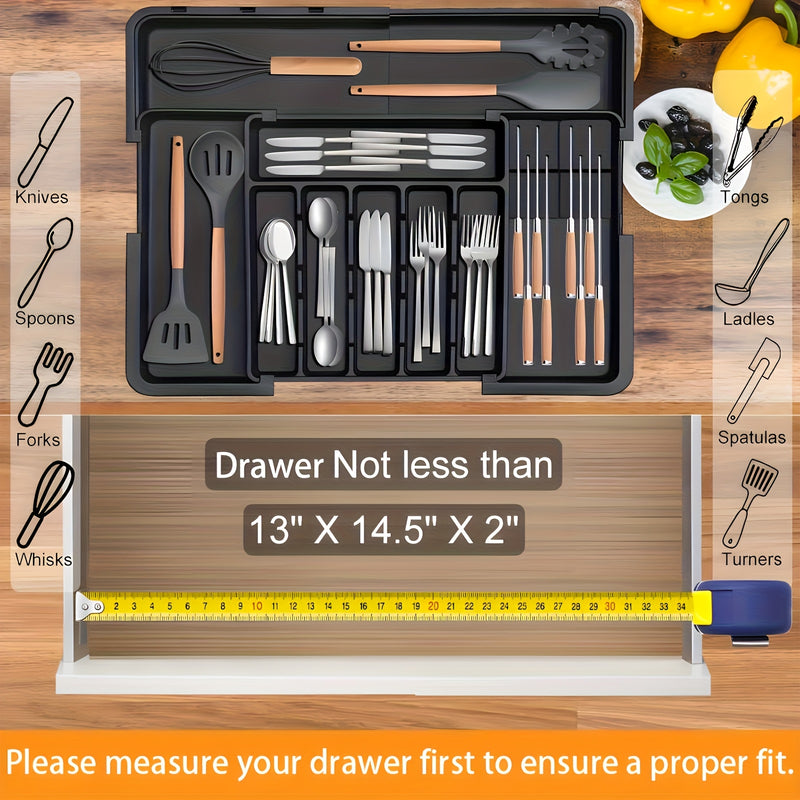 Caja de almacenamiento de cubiertos, organizador de cajones de utensilios de cocina expansible, adecuado para tenedores, cuchillos, soporte de cubiertos de plástico ajustable, división de almacenamiento, uso para todas las estaciones.