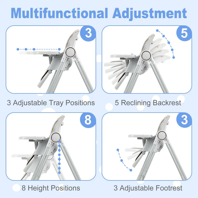Silla alta ajustable con 8 posiciones de altura, 4 opciones de respaldo y 3 ajustes de reposapiés para una comodidad y comodidad personalizadas.