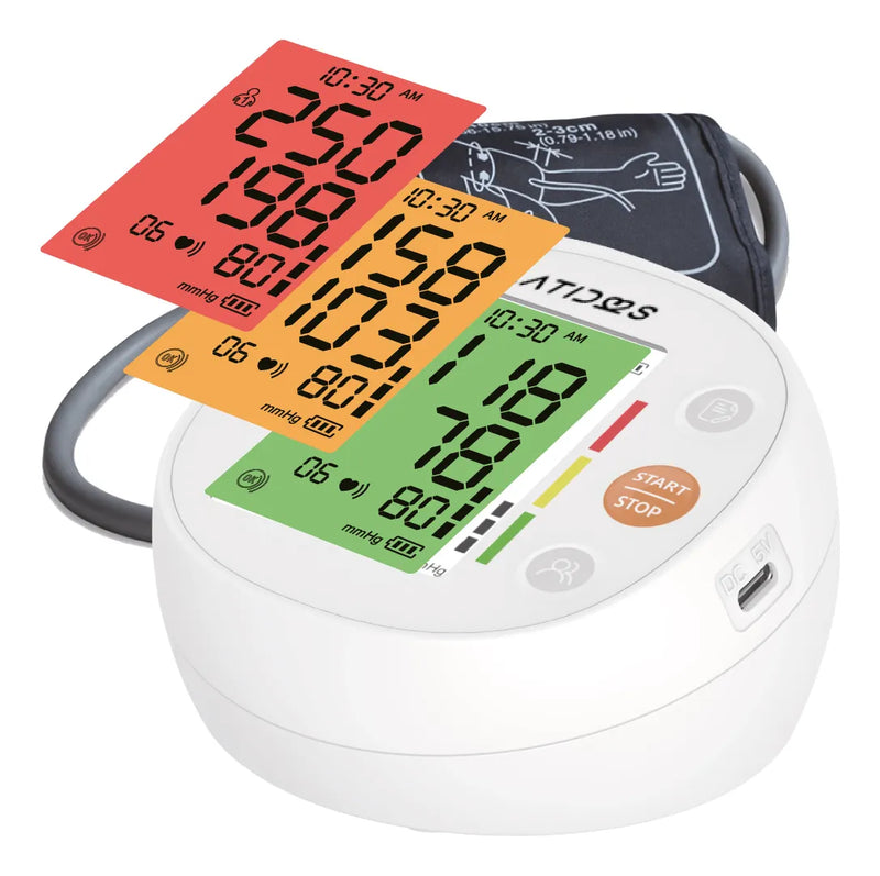 Monitor de presión arterial de brazo de doble usuario y capacidad de almacenamiento de hasta 120 resultados para cada uno. Cuenta con altavoz, pantalla retro iluminada con cuatros colores para indicación de la presión arterial de acuerdo a estándares de la OMS, indicación de movimiento en el brazo e indicación de latidos irregulares. Ideal para seguimiento de la presión arterial en casa.