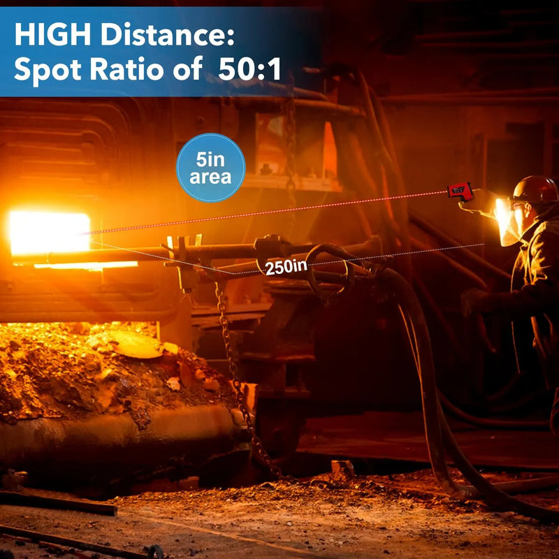 Distancia adicional 50:1 doble punto láser: con relación distancia a punto 50:1, puedes medir altas temperaturas desde una distancia segura sin acercarte demasiado a la fuente de calor, asegurando comodidad y alta seguridad. Láseres digitales duales sin contacto para orientación instantánea, te permiten estar más lejos del calor para medir altas temperaturas. Captura instantánea punto caliente y mide solo en 0.5 segundos