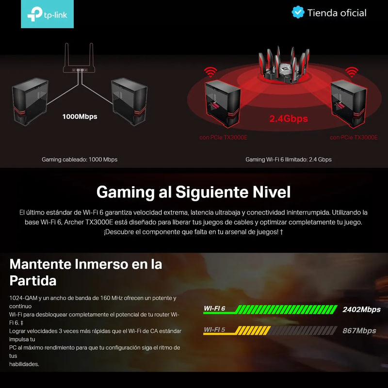 El último estándar de Wi-Fi 6 garantiza velocidad extrema, latencia ultrabaja y conectividad ininterrumpida. Utilizando la base Wi-Fi 6, Archer TX3000E está diseñado para liberar tus juegos de cables y optimizar completamente tu juego. ¡Descubre el componente que falta en tu arsenal de juegos!