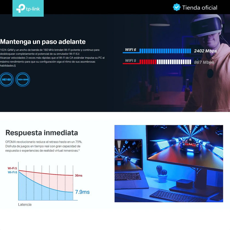 OFDMA revolucionario reduce el retraso hasta en un 75%. Disfruta de juegos en tiempo real con gran capacidad de respuesta o experiencias de realidad virtual inmersivas.