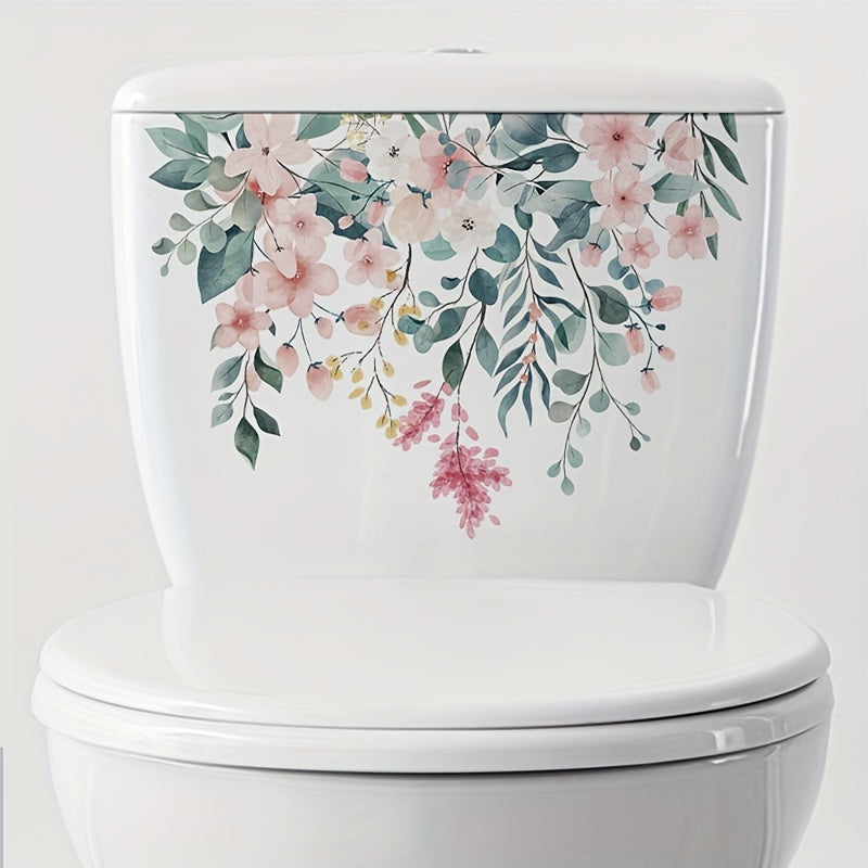 Cubierta decorativa floral para asiento de inodoro, autoadhesiva de PVC, reutilizable, con diseño de flores rosadas y durazno en tapa blanca, decoración para baño