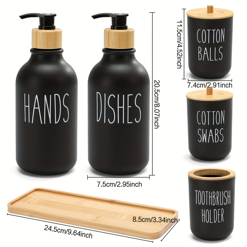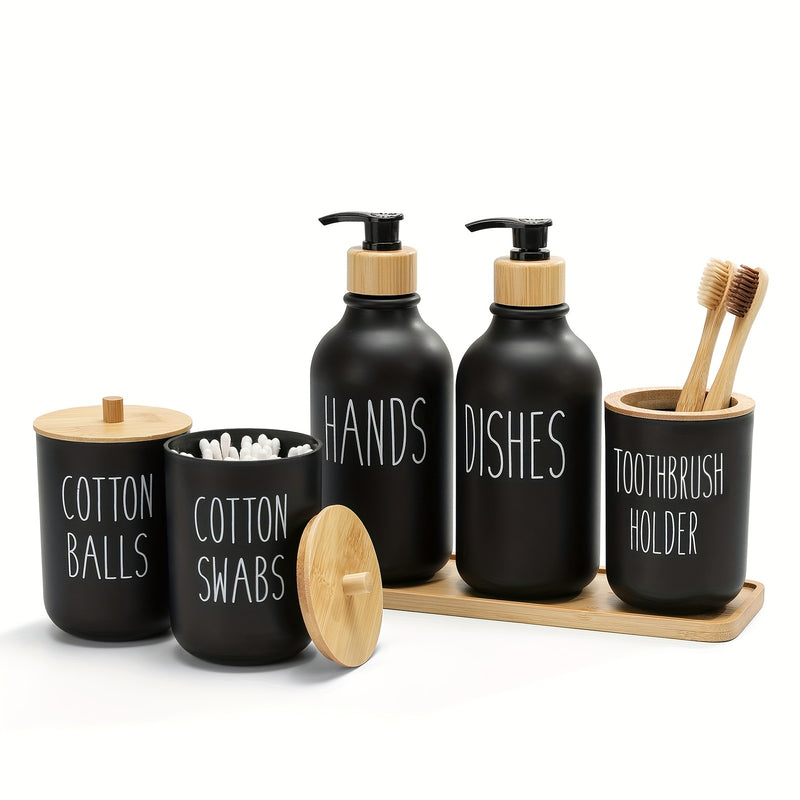 Juego de Accesorios para Baño, Juegos de Accesorios de Plástico para Baño de 6 piezas con Bandeja de Tocador, Dispensador de Jabón, Portacepillos de Dientes, Porta Cepillitos y Bolas con Tapas de Bambú, Estilo Bohemio, Decoración Moderna para el Baño