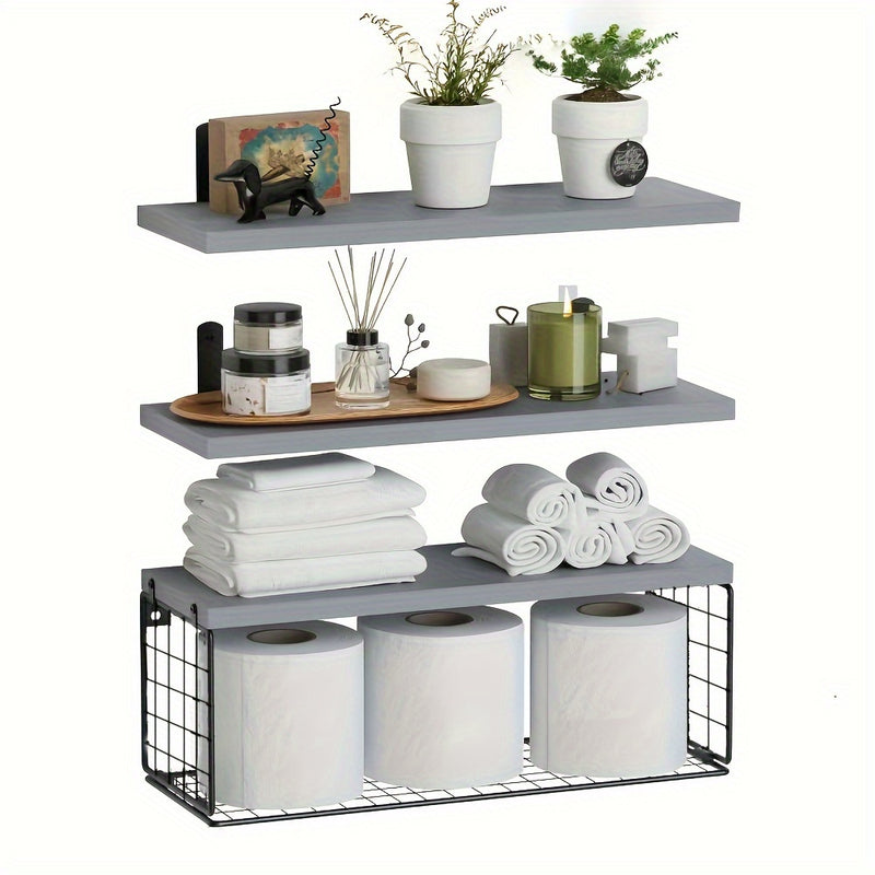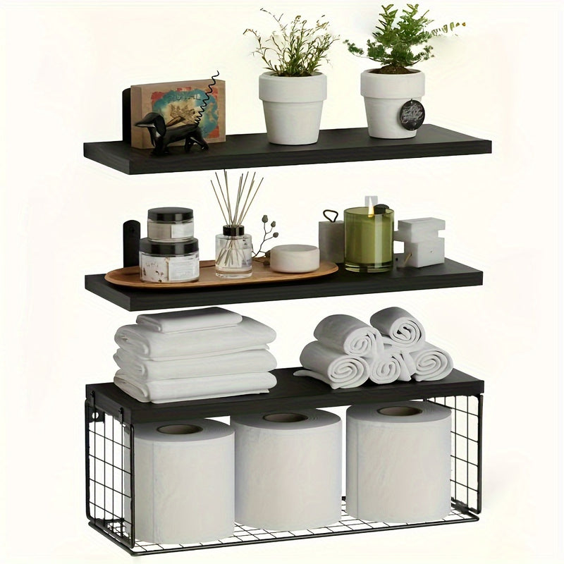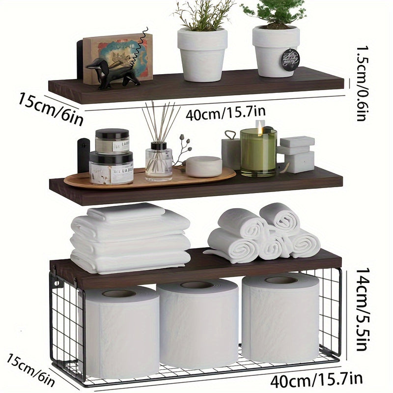 Juego de Estantes Flotantes de Pino Rústico con Portarrollos de Papel Higiénico - Organizador de Baño Montado en la Pared, Sin Tubos Metálicos Incluidos, Almacenamiento de Baño