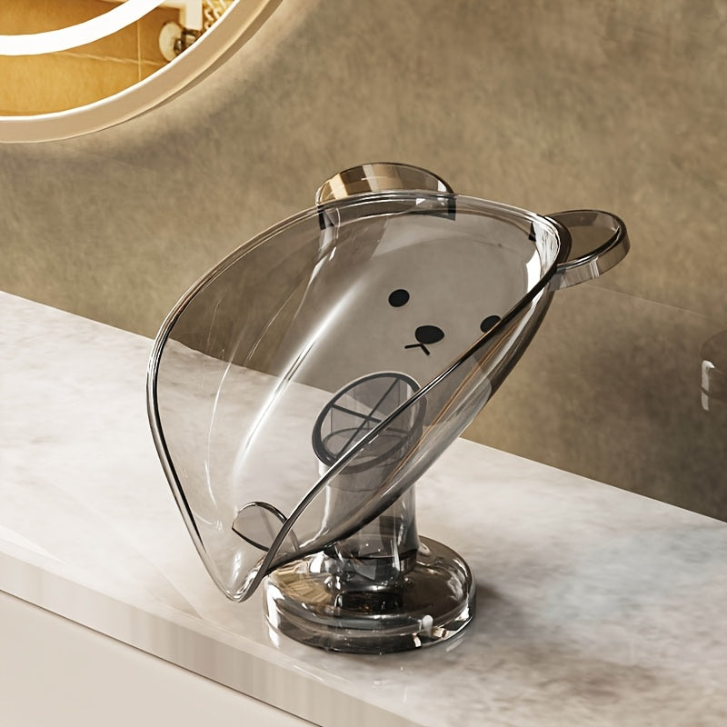 Plato de jabón ovalado de plástico transparente elegante, diseño de oso de dibujos animados, con ventosa y orificio de drenaje, para baño, cocina y ducha - Portasabón sin adhesivo, sin taladrar.
