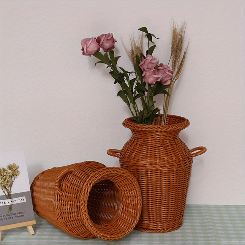 Set De 2 Jarrones De Decoración De Imitación De Ratán Tejido, Maceta De Plástico De Estilo Retro Para Decoración De Mesa, Jarrón De Flores De Artesanía De Ratán Hecho A Mano, Accesorios De Almacenamiento Para Cocina Y Dormitorio