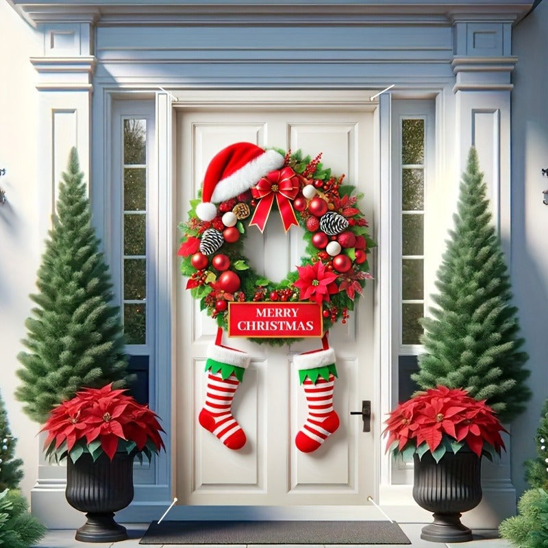Anillo de Puerta con Gorro de Santa y Calcetín - Decoración Navideña Festiva, Fibra de Poliéster, No Necesita Energía, 89.92x180.09cm, Perfecto para Decoración de Fiestas Interior/Exterior