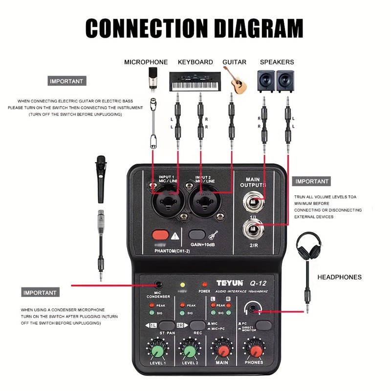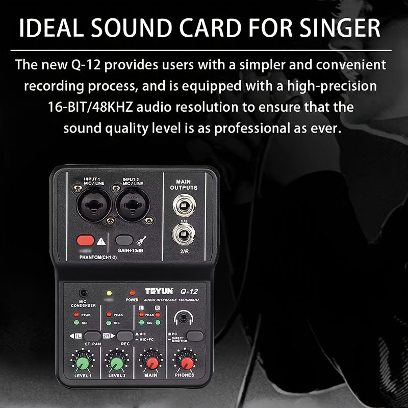 BOMGE Q12 2 canales de interfaz de audio portátil - Mezclador mini USB profesional para guitarra, voces y grabación de estudio, 36V o menos, material ABS negro, 2 canales, 2 canales de interfaz de audio | Mezclador compacto | Construcción duradera