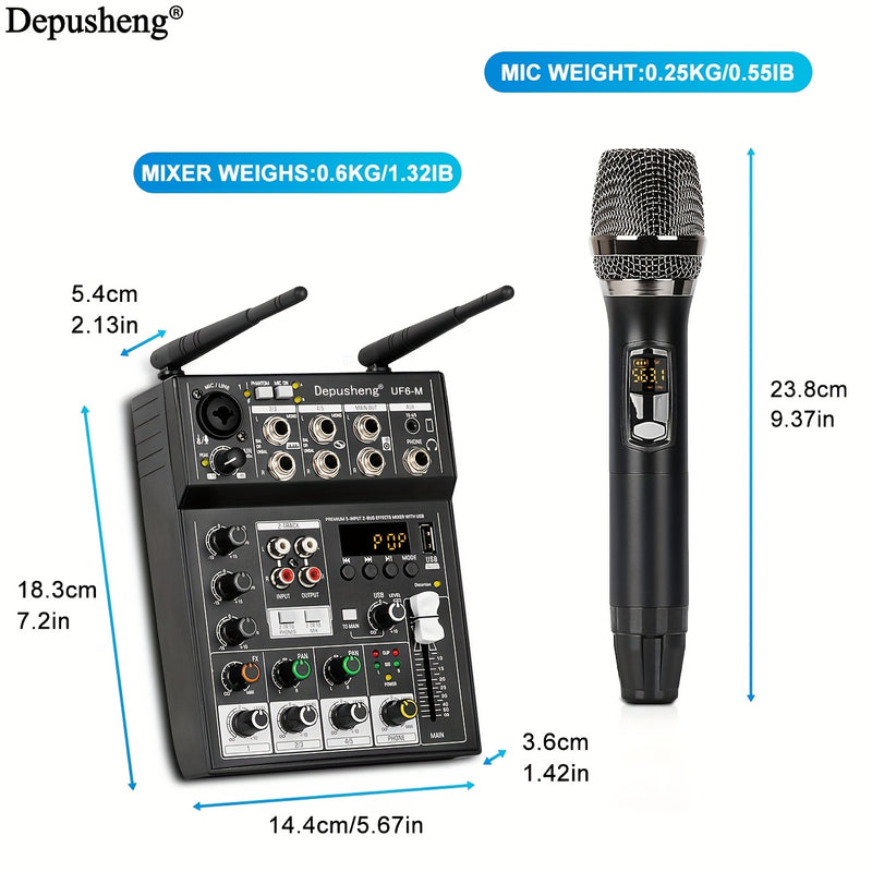 Mixer de audio profesional DEPUSHENG UF6-M de 6 canales, alimentado por USB, tensión de funcionamiento ≤36V, material ABS, receptor incorporado, dos micrófonos inalámbricos, consola de mezcla de sonido para vivo, boda, fiesta, grabación, emisión