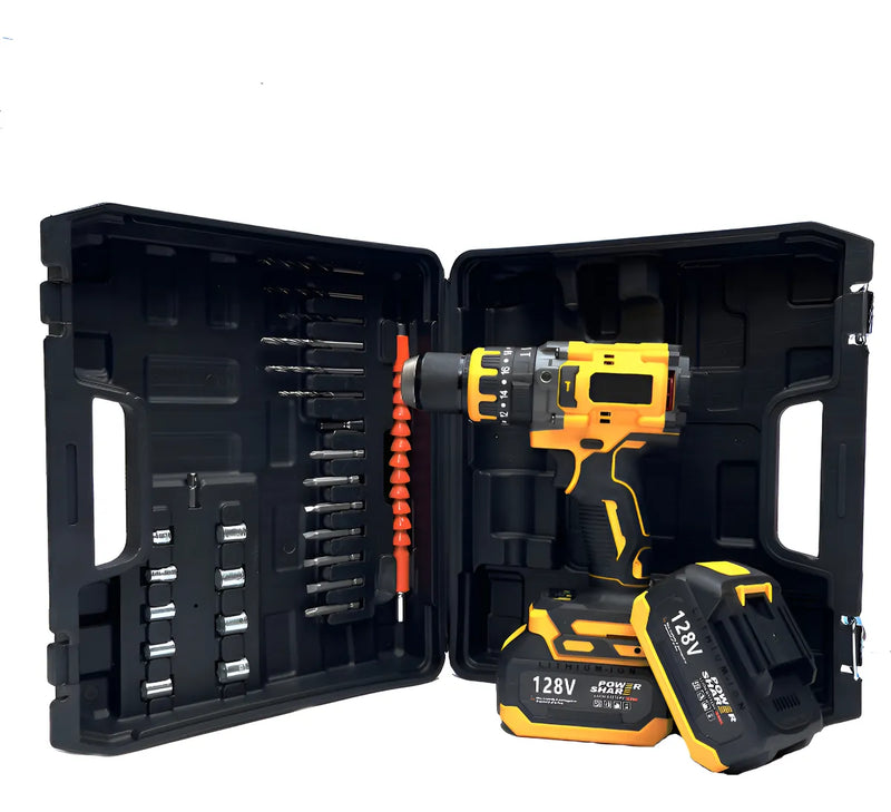 TALADRO INALAMBRICO PERCUTOR, ATORNILLADOR Y PERFORADOR, MANDRIL METALICO 1/2 (13mm), 20 NIVELES DE TORQUE, REVERSIBLE (giro a la derecha y la izquierda), LUZ LED ULTRAPOTENTE, 2 BATERIAS DE LITIO 128 VOLTIOS, DOS VELOCIDADES, NIVEL ESTABILIZADOR, 29 ACCESORIOS, MOTOR BRUSHLESS, 80NM, 500W