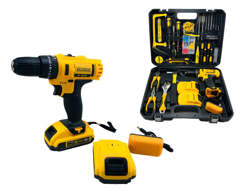 Taladro Percutor 36v Inalámbrico 2baterías + 92 Herramientas Amarillo