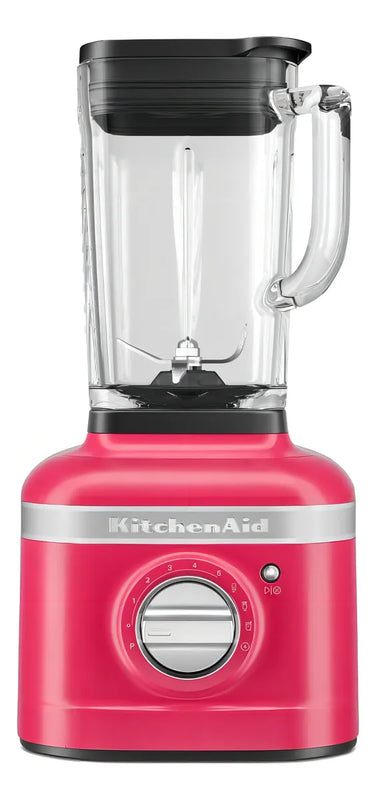 Licuadora K400 KitchenAid en color Hibiscus, seleccionado como el Color del Año 2023. Equipada con un potente motor y 5 velocidades, incluye 3 funciones pre programadas para facilitar su uso. Sus aspas son de acero inoxidable, garantizando durabilidad y eficiencia en el licuado. La jarra de vidrio tiene una capacidad de 48 oz, siendo apta para lavavajillas. Su sistema de licuado de 3 partes permite procesar ingredientes difíciles, logrando texturas y sabores perfectos.