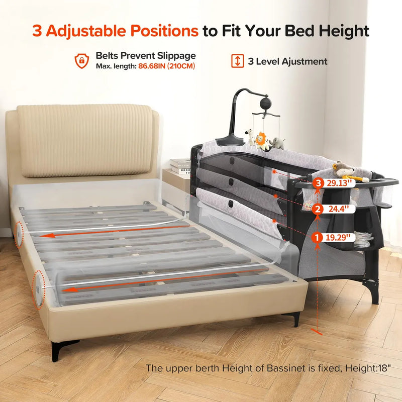 Moisés ancho 4 en 1 con cambiador de pañales, cuna larga junto a la cama con colchón, sábana, música y funda opaca, cama de viaje con almacenamiento, cama de viaje XL con 3 alturas ajustables