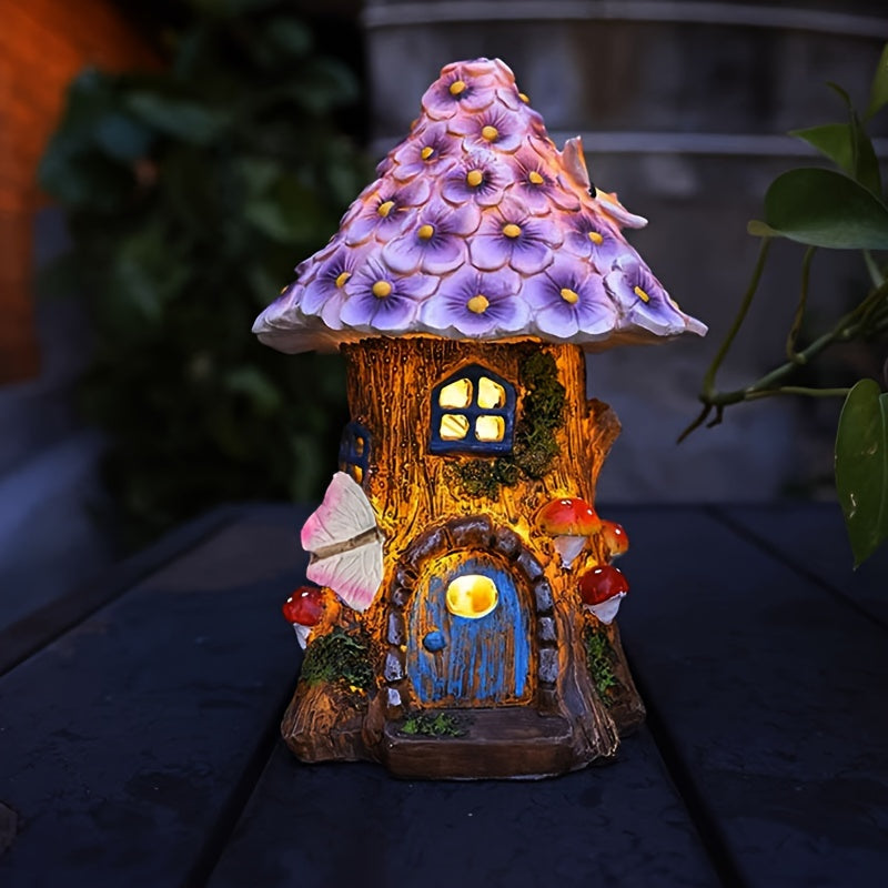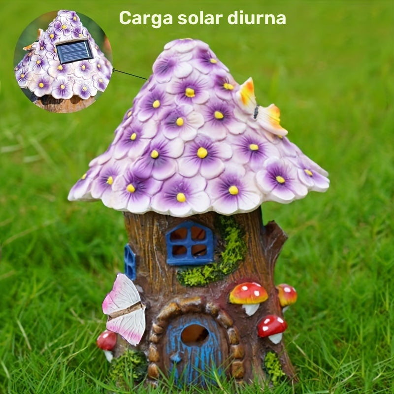 1pc ZYLIWOO Casa de hada de resina solar, luz de jardín eficiente en energía, decorativa figurita de LED de paisaje con patrón de flor, acabado de encaústica, césped exterior, patio, decoración de Halloween para patio trasero