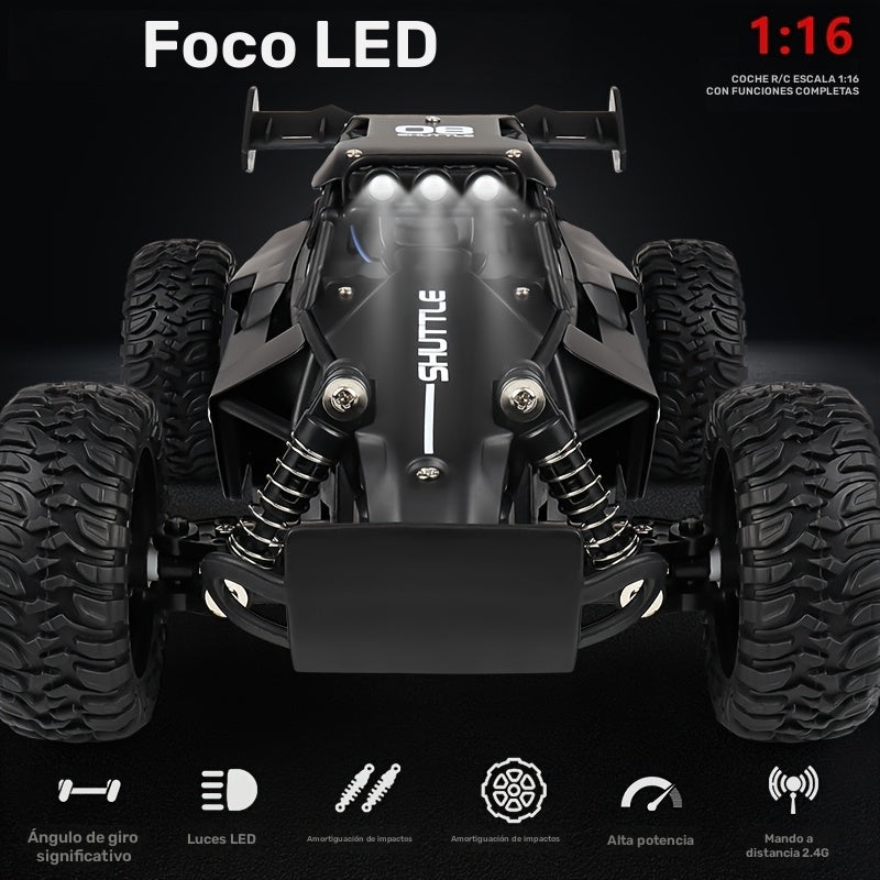 Buggy de RC Todo Terreno a Escala 1:16, Control Remoto de 2,4GHz, Batería de Litio Recargable de 500mAh, 20KM/H, con Luces LED, Carga USB, Anti-Colisión, para Edades de 14+