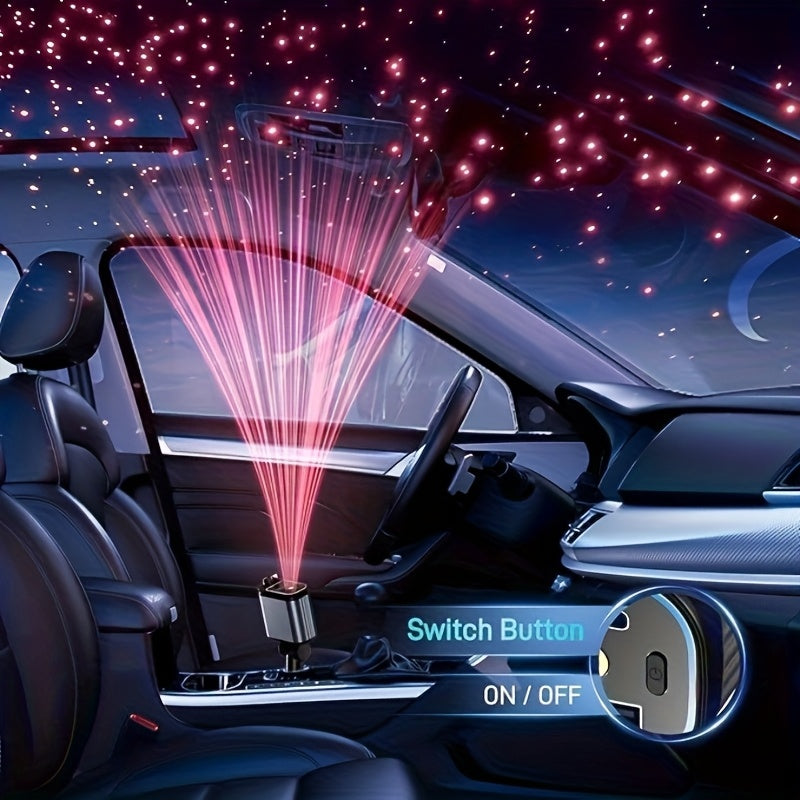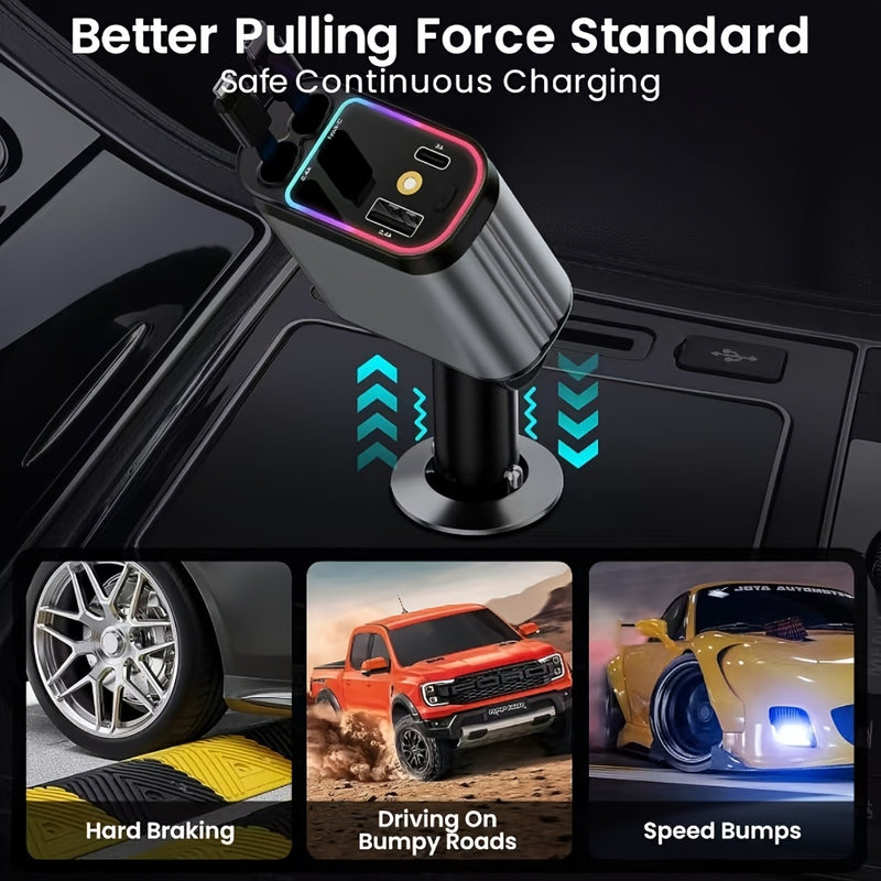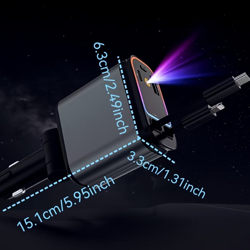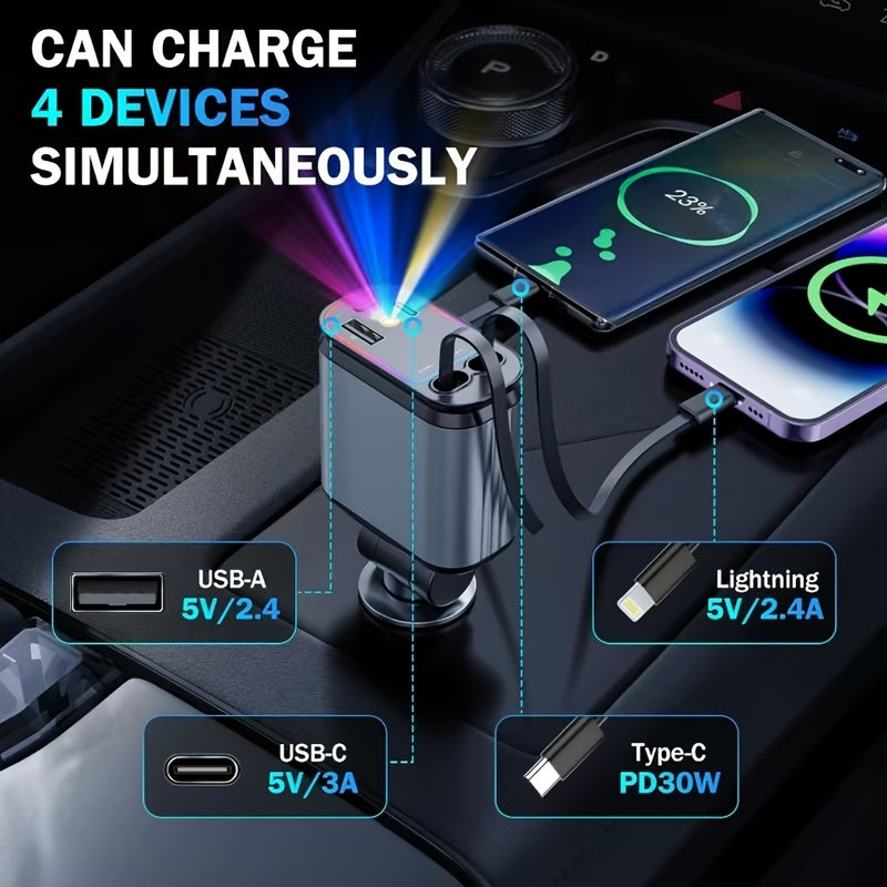 Cargador de coche USB C rápido 4 en 1 con luz ambiental de cielo estrellado (luz roja), 66W, con cable retráctil doble y puerto dual USB, artefacto romántico para vehículo, carga simultánea para 4 dispositivos, ángulo ajustable de 180°, compatible con iP