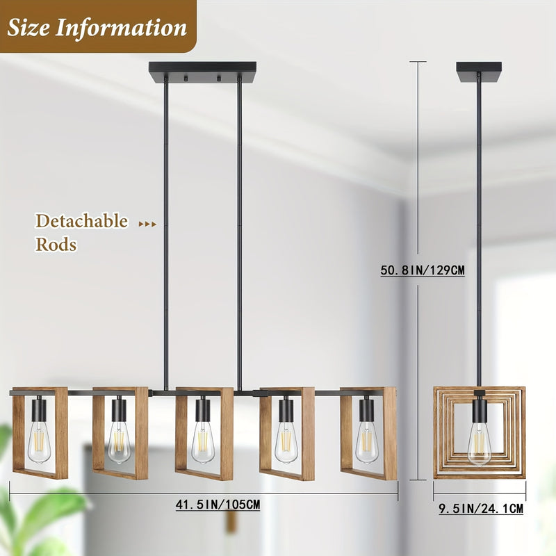 Lámpara de cocina rústica de 105.41 cm - Candil de comedor ajustable con 5 luces, acabado en madera rústica y metal negro mate, montaje semiempotrado con base E26 (focos no incluidos) para cocina, mesa de billar, comedor, iluminación de cocina | Encanto
