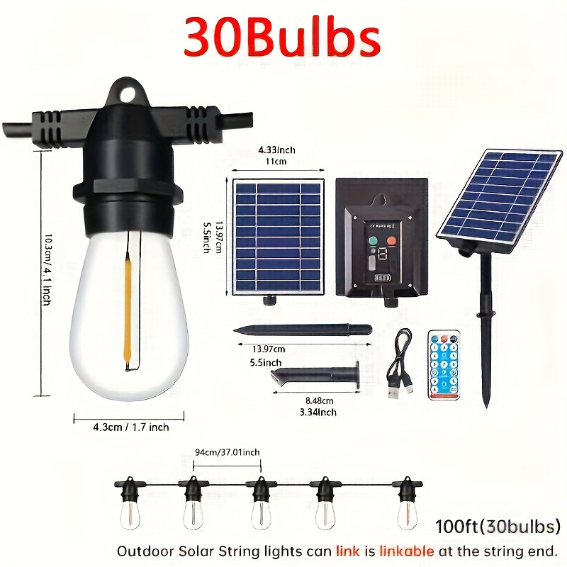 Luces solares con control remoto de 30.48 metros (30 bombillas), luces solares de 13.11/30.48 metros con 11/32 bombillas LED S14 irrompibles, luces solares para patio, jardín, balcón, cerca, camping, fiestas al aire libre, color blanco cálido