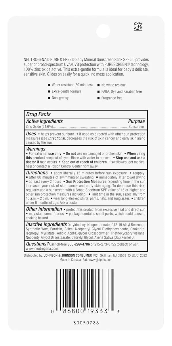 Protector solar para bebés: una barra de 0.47 onzas de Neutrogena Pure and Free Baby Mineral Sunscreen Stick con amplio espectro SPF 50 y óxido de zinc; proporciona a tu bebé una protección solar superior contra los dañinos rayos UVA y UVB para evitar quemaduras solares