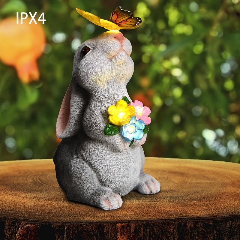 Una estatua de conejo decorativa para exteriores con luces de mariposa solares, perfecta para decoración de jardín, adecuada para patios, balcones y jardines - un regalo de bienvenida a casa único.