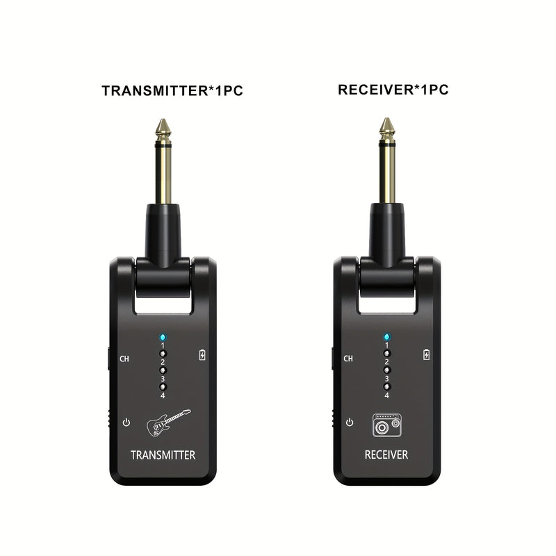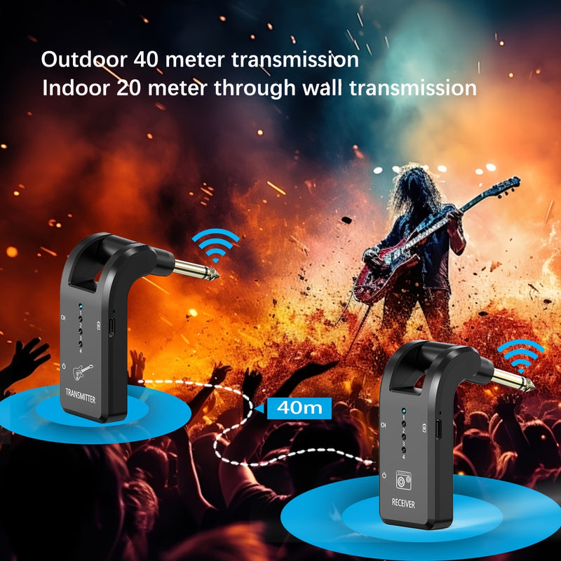 Sistema de guitarra inalámbrico de 2,4 GHz, receptor de audio recargable de 8 canales con carga USB-C, baja latencia para guitarra eléctrica, bajo y más, incluye amplificador, micrófono y accesorios para bajo y guitarra.