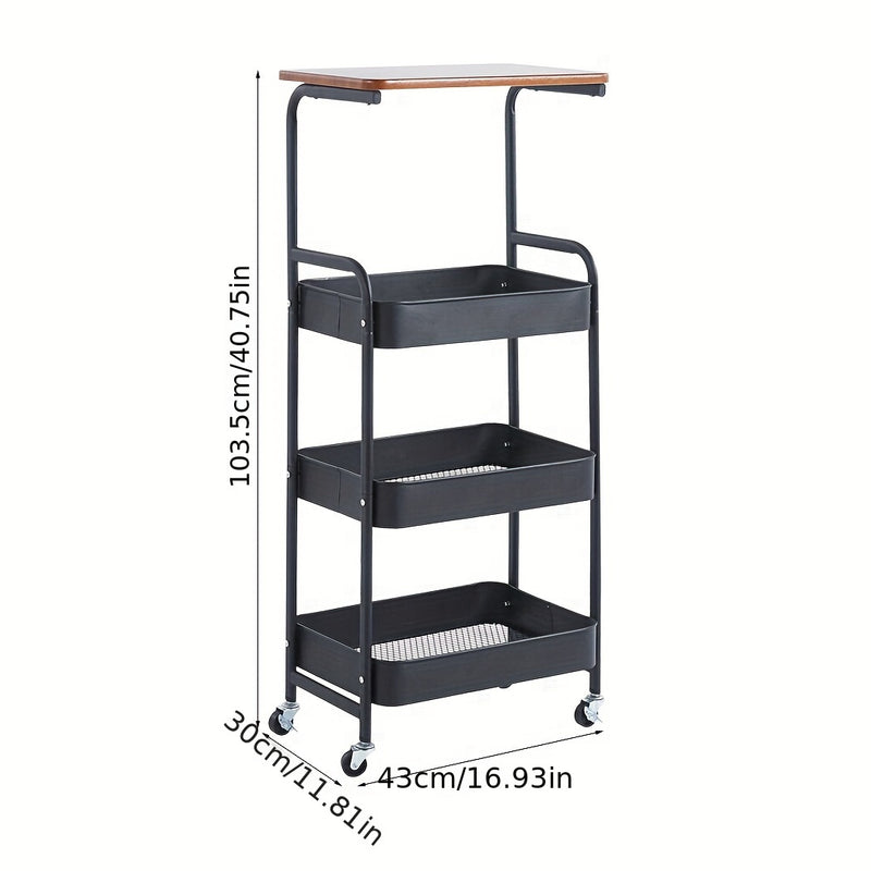 Carrito de Almacenamiento Versátil de 4 Niveles con Ruedas - Diseño Delgado, Tapa de Madera y Cestas de Malla para Cocina, Oficina, Baño - Estructura Metálica Duradera, Acabado en Polvo - Negro/Blanco, Ganchos de Utilidad